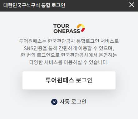 가입은 한국관광공사 통합로그인 서비스인 투어원패스에 카카오톡, 네이버, 구글 등 SNS로 간편 회원가입이 가능합니다. 저도 카카오톡으로 가입해서 1분 만에 회원가입을 했습니다.