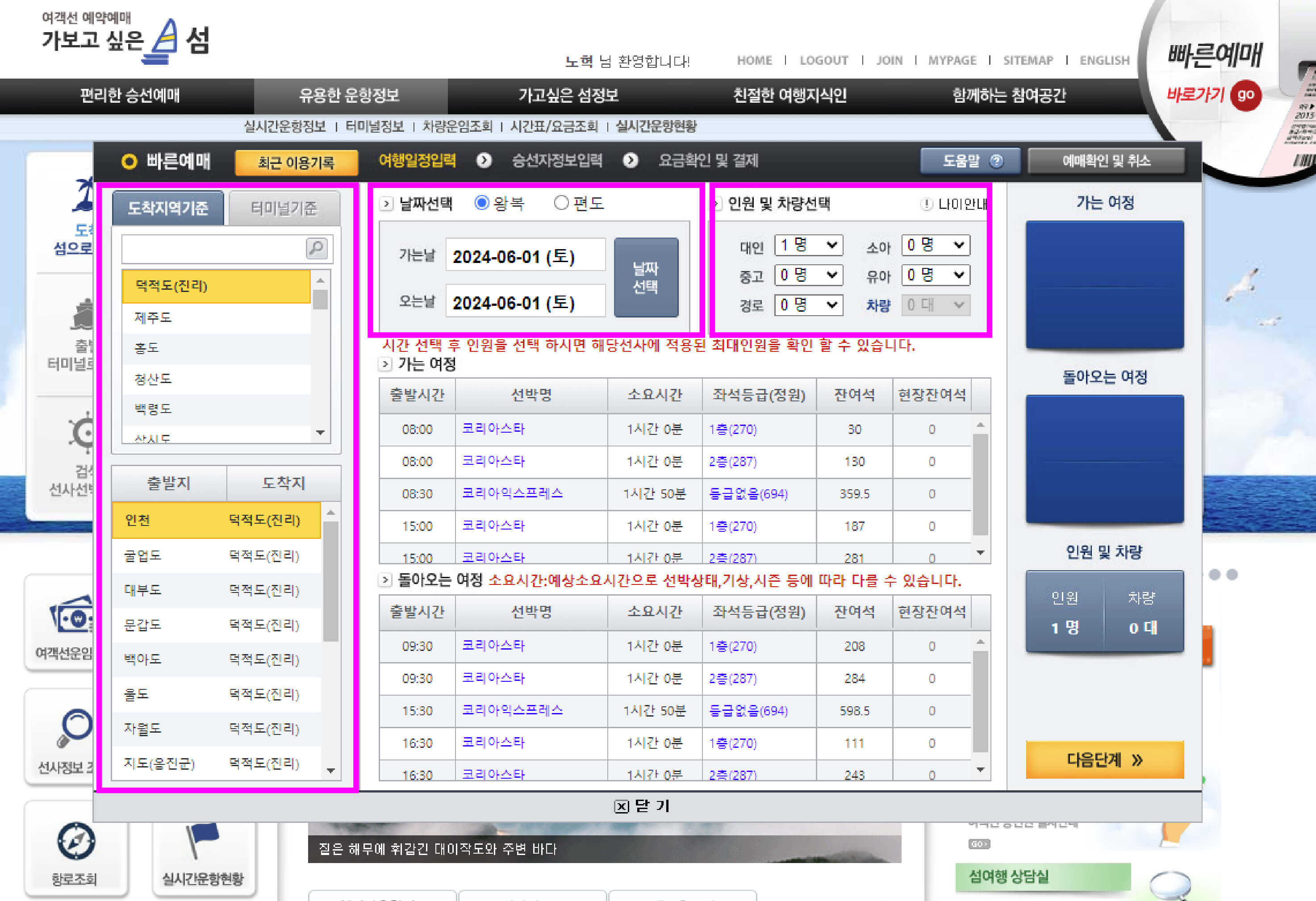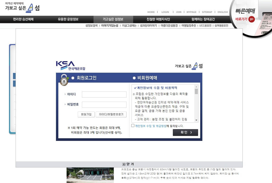 가보고 싶은 섬 예약을 통하여 여객선 예약 전 회원가입은 필수입니다. 신청을 위해서는 로그인을 하셔야 합니다.